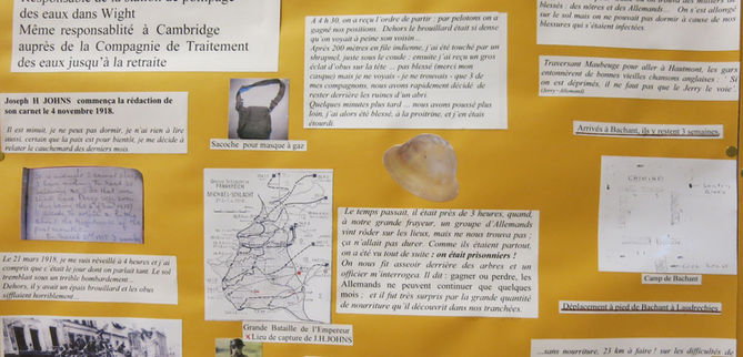 Les autres panneaux ont été composés à partir des documents qui nous ont été confiés par des descendants des Montessonnais de 1914, par des Montessonnais d’aujourd’hui, et par les associations historiques de nos deux villes jumelées, Baesweiler et Thame. Les photos, les lettres, les carnets de guerre, etc. de ces hommes ou de ces femmes sont les témoins d’une époque et d’une société. Ces précieuses archives privées, conservées depuis un siècle dans les familles, sont aujourd’hui des documents historiques. La variété des documents recueillis a guidé le choix des thèmes de nos panneaux, sur différents aspects de la vie quotidienne, au front et à l’arrière. Plusieurs vitrines rassemblent les objets prêtés par les familles, liés à l’armement et à l’équipement, à la vie dans les tranchées, à l’artisanat dit « des tranchées », aux récompenses…
